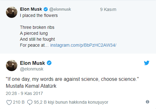 Elon Musk sorulan sorulara verdiği cevapta “Bu yıl içinde Tesla’nın Türkiye için satışa başlamasını planlıyoruz. Ülkenizi çok seviyorum. Bu yüzden de piyasaya sunmak için bizzat orada olacağım.” dedi. Elon Musk yaptığı Türkiye ziyaretinden ne kadar memnun olduğunu paylaşmış hatta Ankara’da Cumhurbaşkanı Recep Tayyip Erdoğan’la bir görüşme yapmıştı. Anıtkabir’i de ziyaret eden Elon Musk Atatürk’ün bir sözünü İngilizce olarak paylaşmıştı.