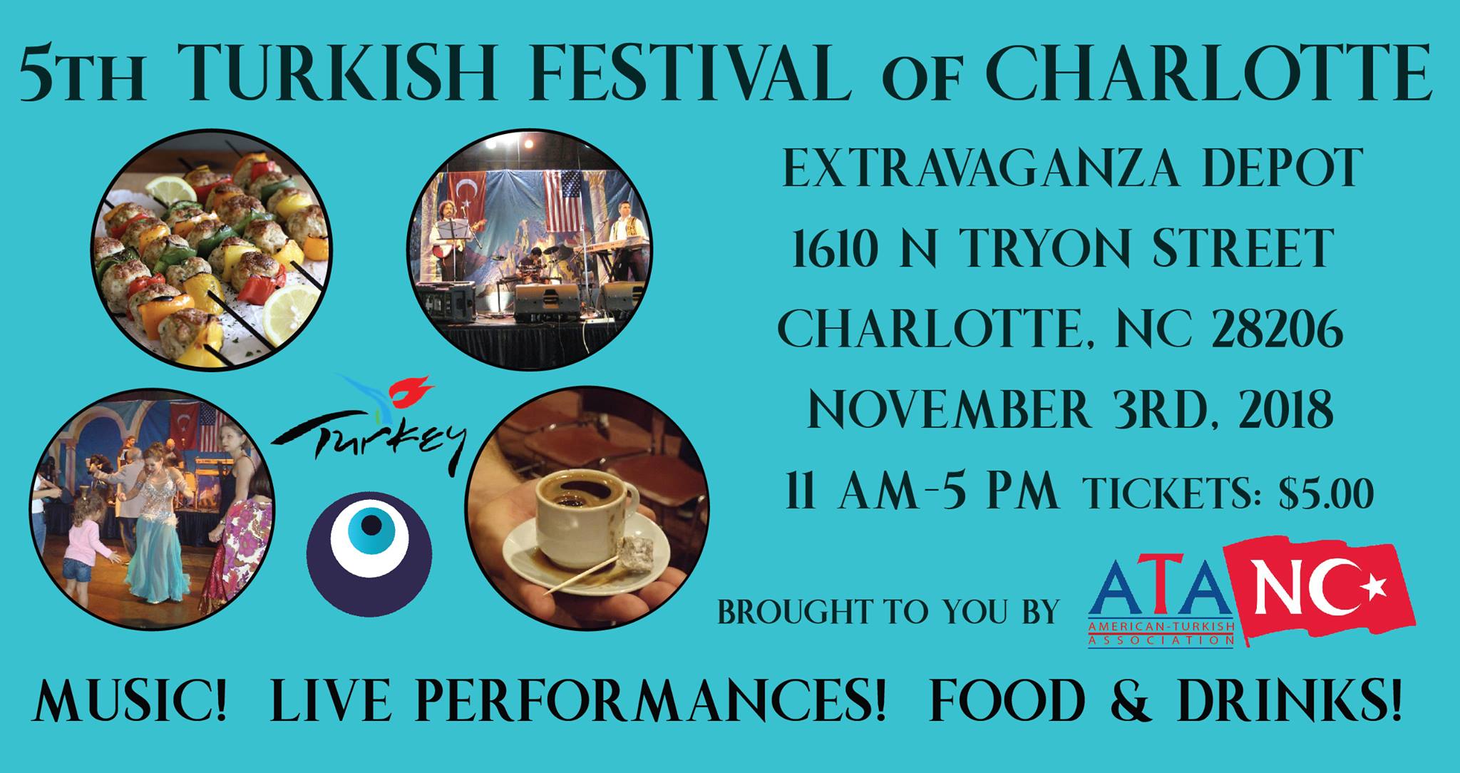 We welcome you, your family and friends to the 5th Turkish Festival of Charlotte. Save the date and join us to experience and savor Turkish hospitality, culture,heritage and cuisine through delicious Turkish food and Coffee, fortune telling, live performances of music and dance, cooking demos, bazaar, children's activities and much more. Tickets are $5.00, kids under 6 are free.