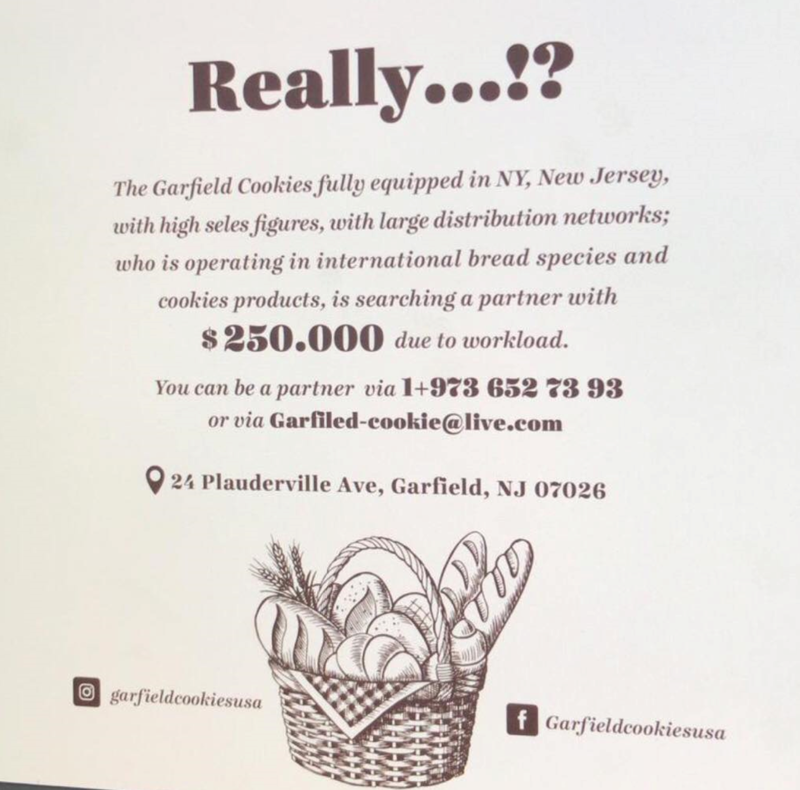 New Jersey'de bulunan tam donanımlı bread ve cookies ürünlerinde faaliyet gösteren; satış rakamları yüksek, geniş dağıtım ağına sahip, ürün çeşitliliği olan Garfield Cookies'e ortak arıyorum.