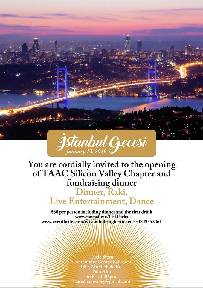 Dear Members of the Turkish-American Community, TAAC Silicon Valley chapter cordially invites you to the opening night of our chapter. We are looking forward to seeing you on January 12, 2019