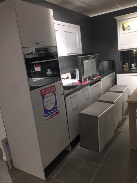 Weg=Weg ahoowroom keuken met AEG apparatuur (vaatwasser, combi oven, koelkast, kookplaat en afzuigkap)