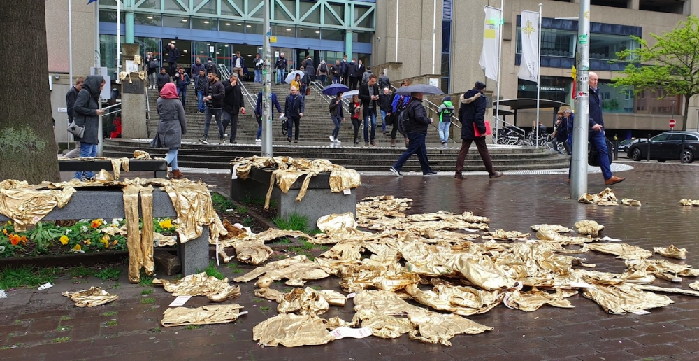 Belçika'nın başkenti Brüksel'de Sanat Evi Gücü'nün "Kayıp Bulunamadı" projesi kapsamında Avrupa'da kaybolan 10 bin kayıp mülteci çocukla ilgili farkındalık oluşturmak amacıyla sokaklarda kıyafet sergisi yapıldı. Avrupa Parlamentosu binası ve mültecilerin yoğun olduğu Kuzey tren istasyonu gibi Brüksel'in çeşitli bölgelerinde kaldırımlara yüzlerce altın renkli çocuk kıyafeti yerleştirdi.