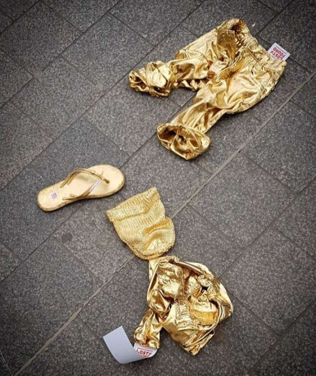 Belçika'nın başkenti Brüksel'de kayıp 10 bin mülteci çocuğa dikkat çekmek için kaldırımlarda altın rengine boyanmış mülteci çocukların kıyafetleri sergilendi.