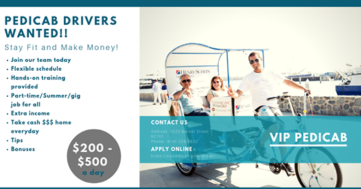 100'den fazla pedicab ile San Diego'daki en buyuk pedicab firmasi olan VIP Pedicab, bisiklet kullanmaktan keyif alan, enerjik, eglenceli, San Diego'yu tanitacak suruculer ariyor.