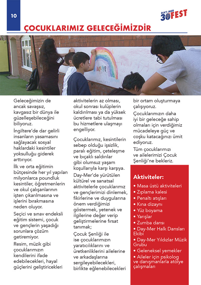 DAY-MER, 30’ncı yılı dolayısıyla zengin bir festival program hazırladığını açıkladı. DAY MER çatısındaki Londra Meydan Sahnesi’nin 12 Haziran’da 30’ncu yıl kutlaması etkinliği ile başlayacak festival, 7 Temmuz Clissold Park’ta Selda Bağcan ve Moğollar’ın da sahneye çıkacağı Park Şenliği ile sona erecek…