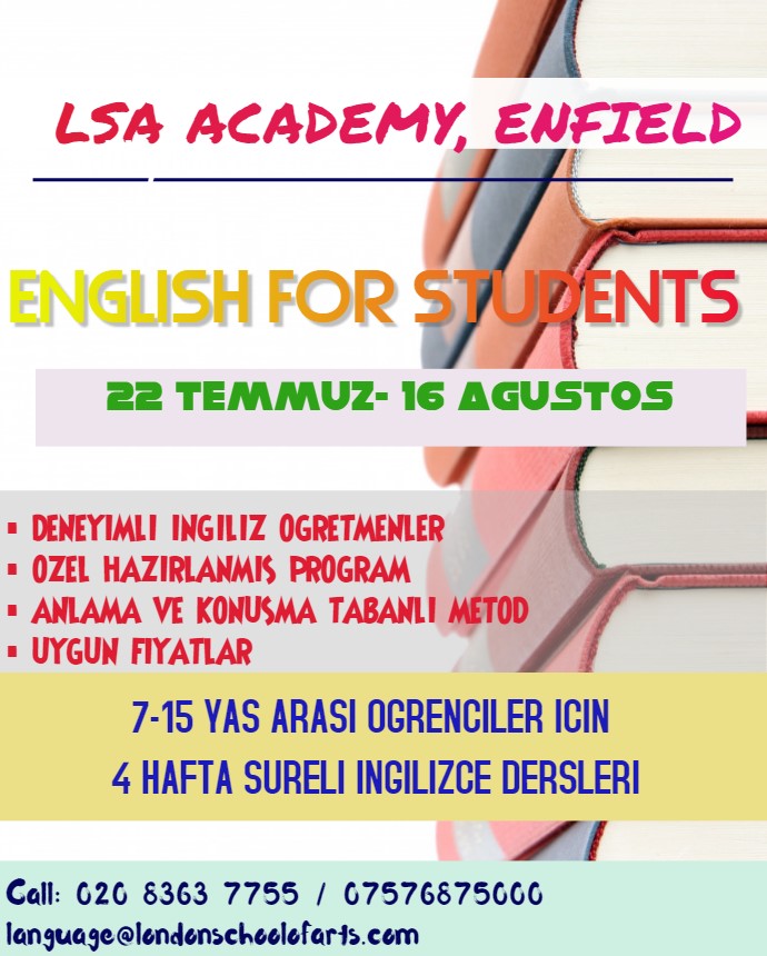 SON 4 GUN!!! 22 Temmuz - 16 Agustos tarihleri arasinda LSA Academy Enfield tarafindan duzenlenen ve 4 hafta surecek Ingilizce ve Oryantasyon Egitimi icin az sayida bos yerimiz kalmistir. Kings College mezunu ogretmenler tarafindan verilecek Ingilizce ve Oryantasyon Egitimi ozellikle 9-15 yaslari arasinda ogrencilerin Ingilizce dil duzeylerini yukseltmeyi ve Matematik, Fen Bilimleri vb derslerin kavram ve terminolojisini ogretmeyi amaclamaktadir. Turk cocuklarin ogrenme egilimleri de goz onune alinarak en son TEFL metodolojisine gore Bogazici Universitesi Egitim Fakultesi mezunu deneyimli egitimciler tarafindan hazirlanmis mufredati ile ogrencilerin yeni ogretim yilina ozguvenleri yuksek ve Ingilizce problemi olmadan girmeleri icin SON 4 GUN!!! Detayli bilgi ve randevu icin 020 8363 77 55 numarali telefonu arayabilir <a href='mailto:language@londonschoolofarts.com'>language@londonschoolofarts.com</a> e-posta adresinden bize ulasabilirsiniz.