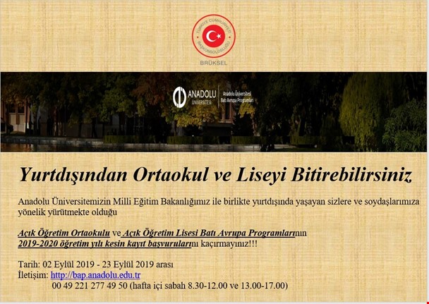 Anadolu Üniversitemizin Milli Eğitim Bakanlığımız ile birlikte yurt dışında yaşayan sizlere ve soydaşlarımıza yönelik yürütmekte olduğu: Açık Öğretim Ortaokulu ve Açık Öğretim Lisesi Batı Avrupa Programlarının 2019-2020 öğretim yılı kesin kayıt başvurularını kaçırmayınız.