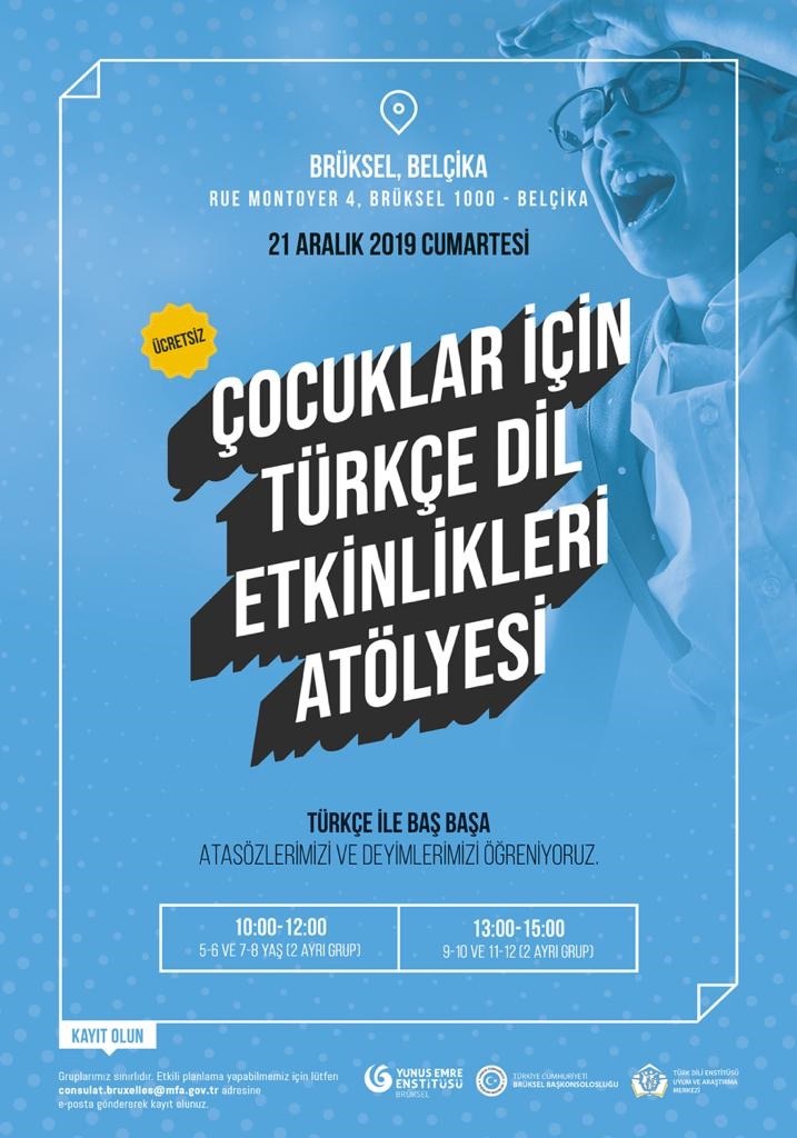 Brüksel Başkonsolosluğu, Brüksel Yunus Emre Enstitüsü ve Türk Dili Enstitüsü Uyum ve Araştırma Merkezi’nce 21.12.2019’da 6-12 yaş çocuklarımız için "Atasözlerimiz ve Deyimlerimizi Öğreniyoruz" etkinliğine bekliyoruz.