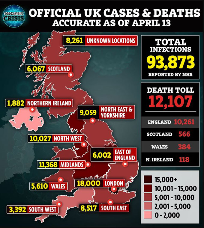 İngiltere'de yeni tip koronavirüs (Kovid-19) nedeniyle hayatını kaybedenlerin sayısı son 24 saatte 778 artarak 12 bin 107'ye yükseldi.