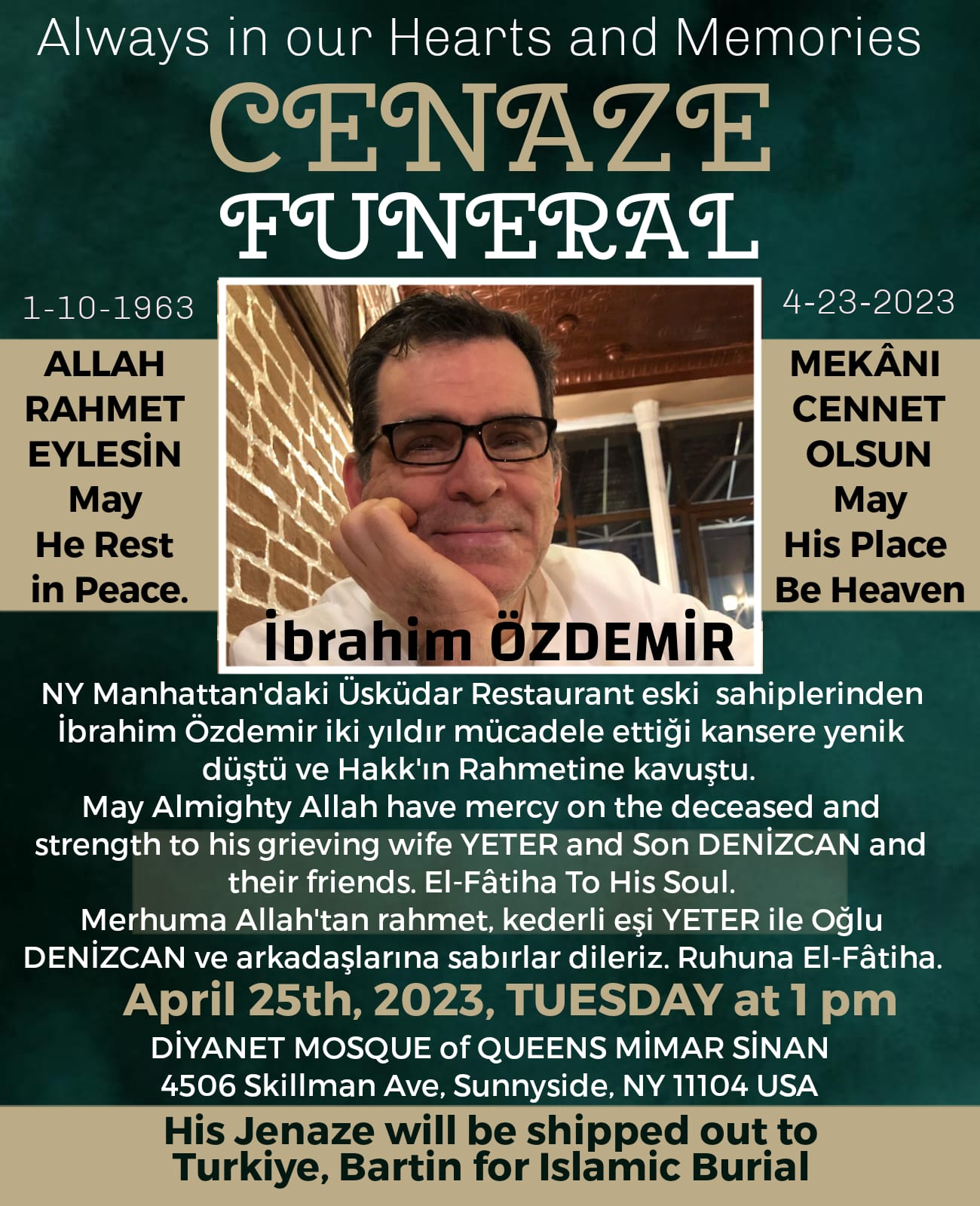Dün sabah saatlerinde vefat eden Manhattan'daki meşhur Üsküdar Restaurant'ın eski sahiplerinden olan İbrahim Özdemir yarın defnedilecek...