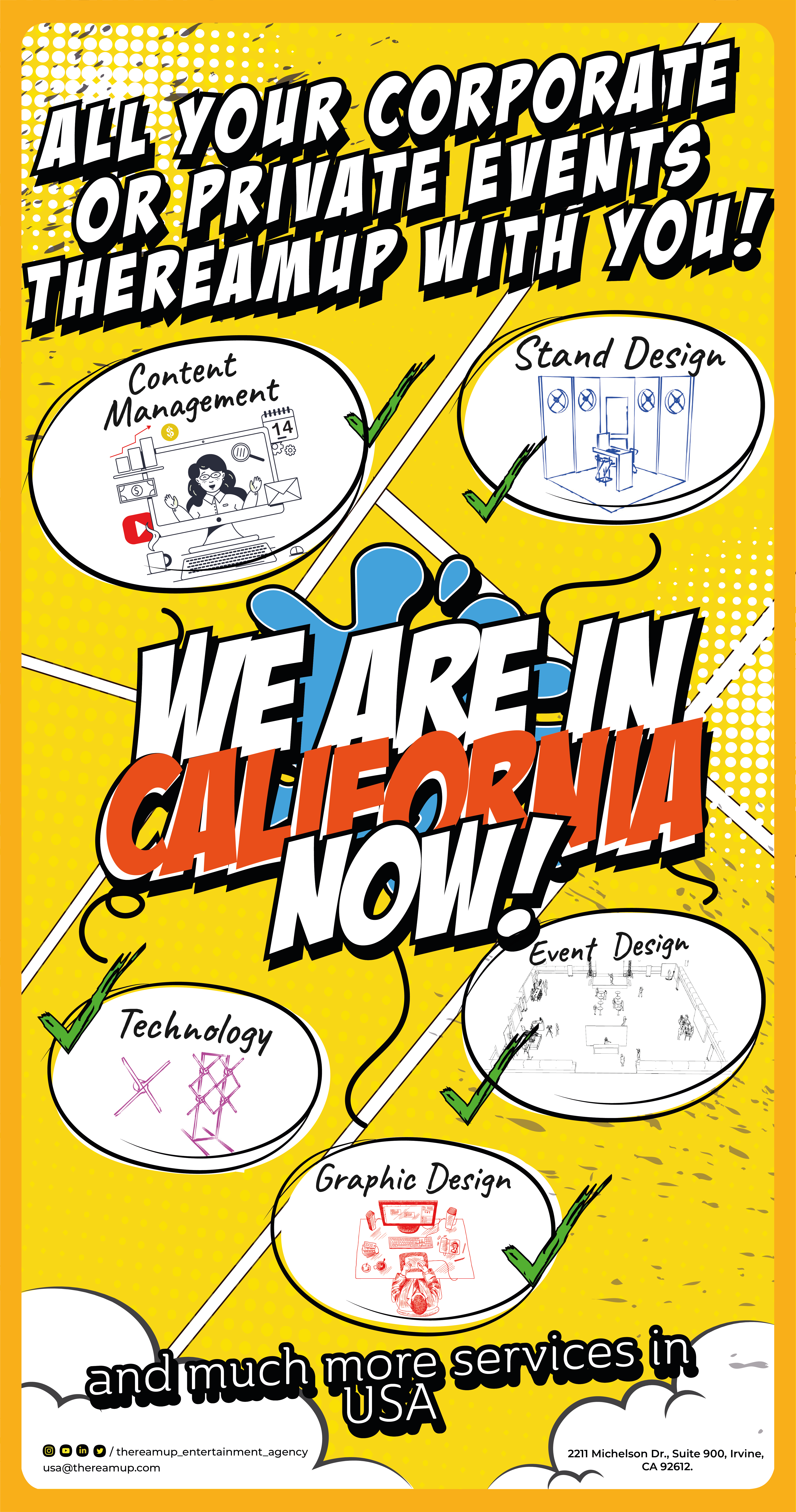 Istanbul ve Irvine'da ofisleri olan TheReamUp şimdi tam zamanlı olarak Birleşmiş Devletler'de! Tüm özel ve şirket etkinliklerinizde etkinlik tasarımı, stant tasarım ve üretimi, teknoloji, içerik yönetimi gibi konuların yanında şirketleriniz için marka kimliği oluşturma, sosyal medya yönetimi, web sitesi tasarımı ve promosyon hizmetlerimizle her zaman yanınızdayız!