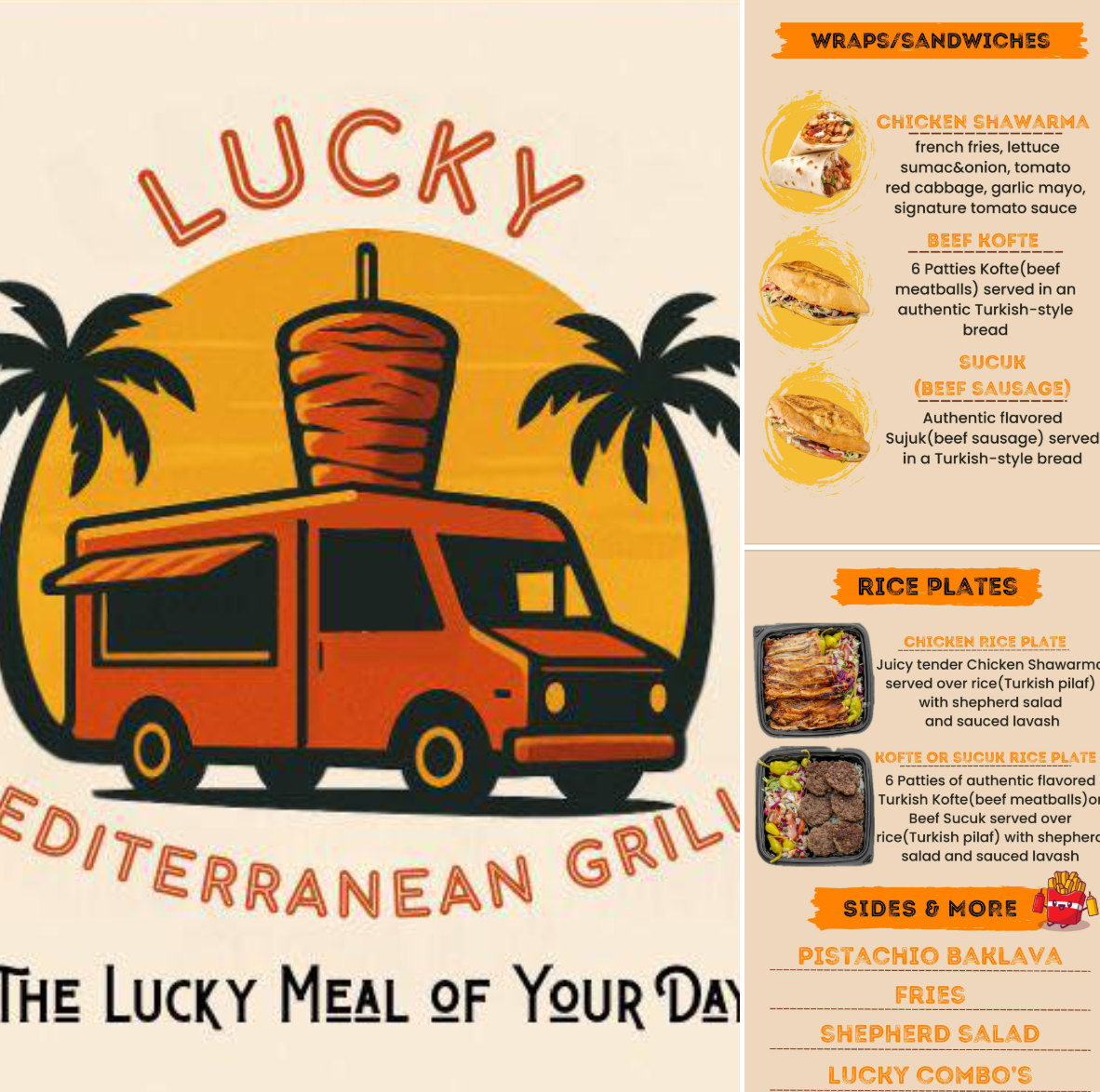 Lucky Truck bugünden itibaren haftanın her günü 6PM’de sizlerle buluşuyor. Başlangıç olarak Hatay usulü tavuk döner, kasap köfte ve kasap sucuk ürünlerimizi dürüm, ekmek arası ve porsiyon (pilav üstü) şeklinde servis ediyor olacağız. Özel soslarımız ve sidelarımız ile sizlerle buluşmaya sabırsızlanıyoruz.