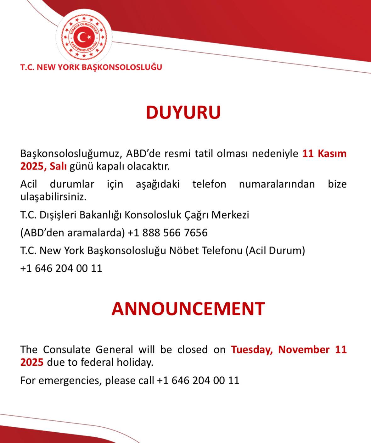 T.C. New York Baskonsoloslugu Nöbet Telefonu (Acil Durum)