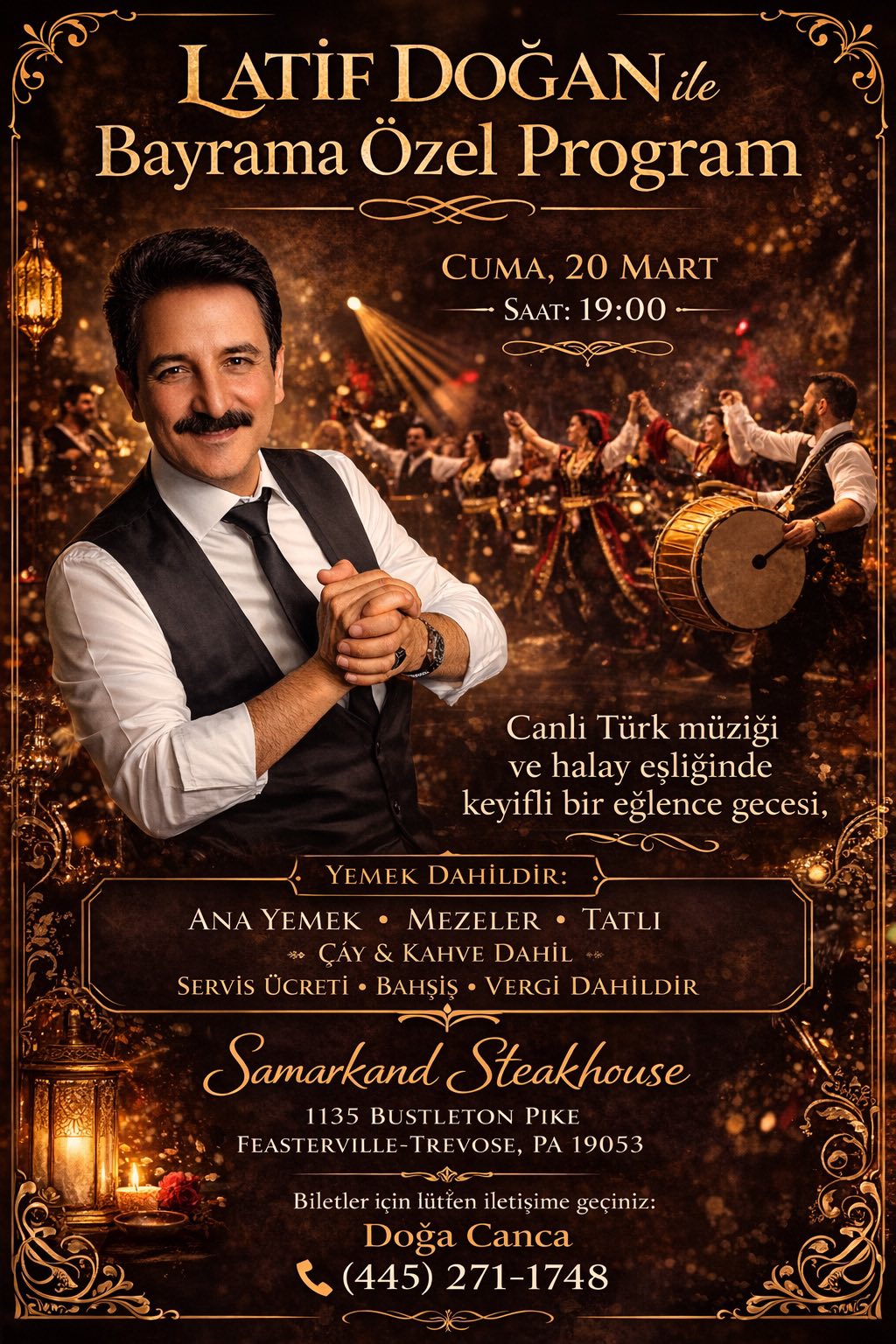 Türk müziğinin sevilen sanatçılarından Latif Doğan, özel bir bayram gecesinde sizlerle buluşuyor. Canlı Türk müziği, halaylar ve unutulmaz bir eğlence atmosferi eşliğinde keyif dolu bir geceye hazır olun.