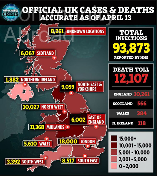 İngiltere'de yeni tip koronavirüs (Kovid-19) nedeniyle hayatını kaybedenlerin sayısı son 24 saatte 778 artarak 12 bin 107'ye yükseldi.