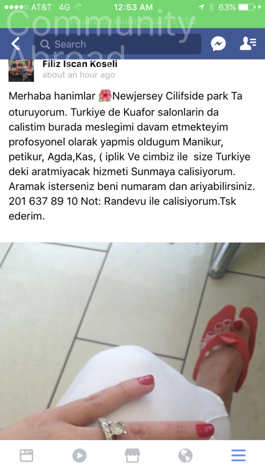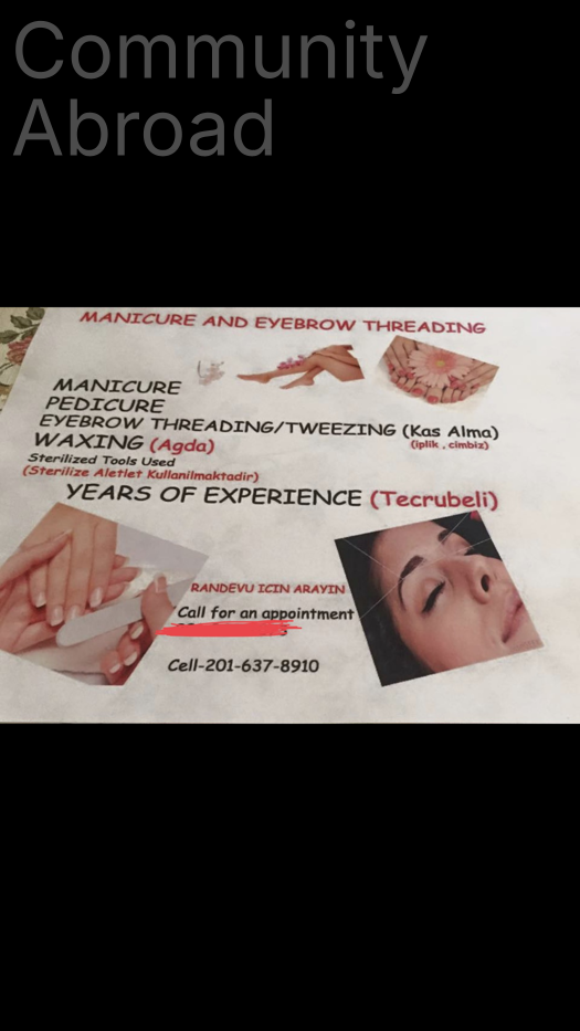 Merhabalar. Turkıye’dekı gıbı Turk usulü manikur, petikur, ağda, kas yuz Hızmetı verıyorum. Randevu ıle calısıyorum.Masanger den Whats up tan .ulasabılırsınız .Not sadece Bayanlara özel dır.