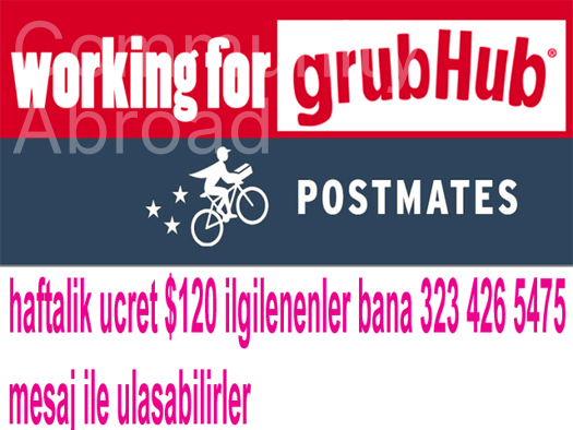 IS ILANI arabasi,scooteri,bisikleti olan ogrenci arkadaslar grubhub veya postmate hesabimi kiraliktir istediginiz kadar calisin , haftalik ucret $120 ilgilenenler bana 323 426 5475 veya PM mesaj ile ulasabilirler