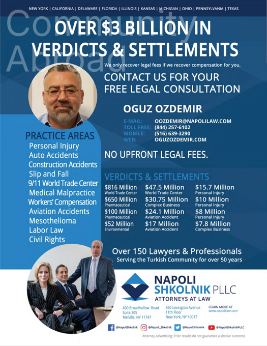 Trafik Kazaları Yanlış Tıbbi Müdahele Sakatlık Tehlikeli Ilaçlar Amerikada avukat mı bakıyorsunuz? Ücretsiz Danışmanlık için bizi hemen arayın. Oğuz Özdemir 1-844-257-6102 oozdemir@napolilaw.com