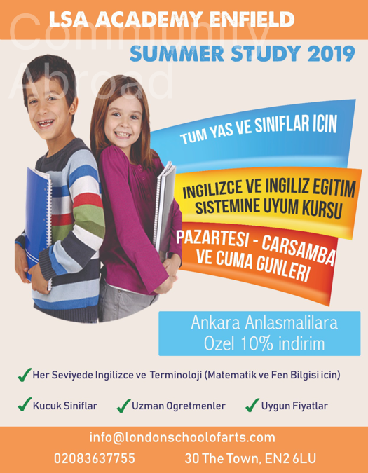 Ankara Anlasmasi ile Ingiltere’ye gelen cocuklarin egitim sistemine entegrasyonunu hizlandirip, ilk aylarda yasayabilecekleri sorunlari azaltmak ve adaptasyon surecini kolaylastirmak amaciyla LSA Academy, Enfield’ta 22 Temmuz – 16 Agustos 2019 tarihleri arasinda Ingilizce ve Terminoloji kursu acilacaktir. Hafta ici 3 gun ve haftada toplam 10 saat olarak hazirlanan programda cocuklarin temel konusma, dinleme ve okuma becerileri gelistirilecek, Matematik, Fen Bilgisi gibi derslerin altyapisini olusturan temel kavram ve terimlerin Ingilizceleri ogretilecektir. Ayrintili bilgi almak ve sinirli sayidaki kontenjandan yerinizi ayirtmak icin 020 8363 7755 numaradan okulumuzu ve/ya 07576875000 numaradan yetkili kisiyi arayabilirsiniz.